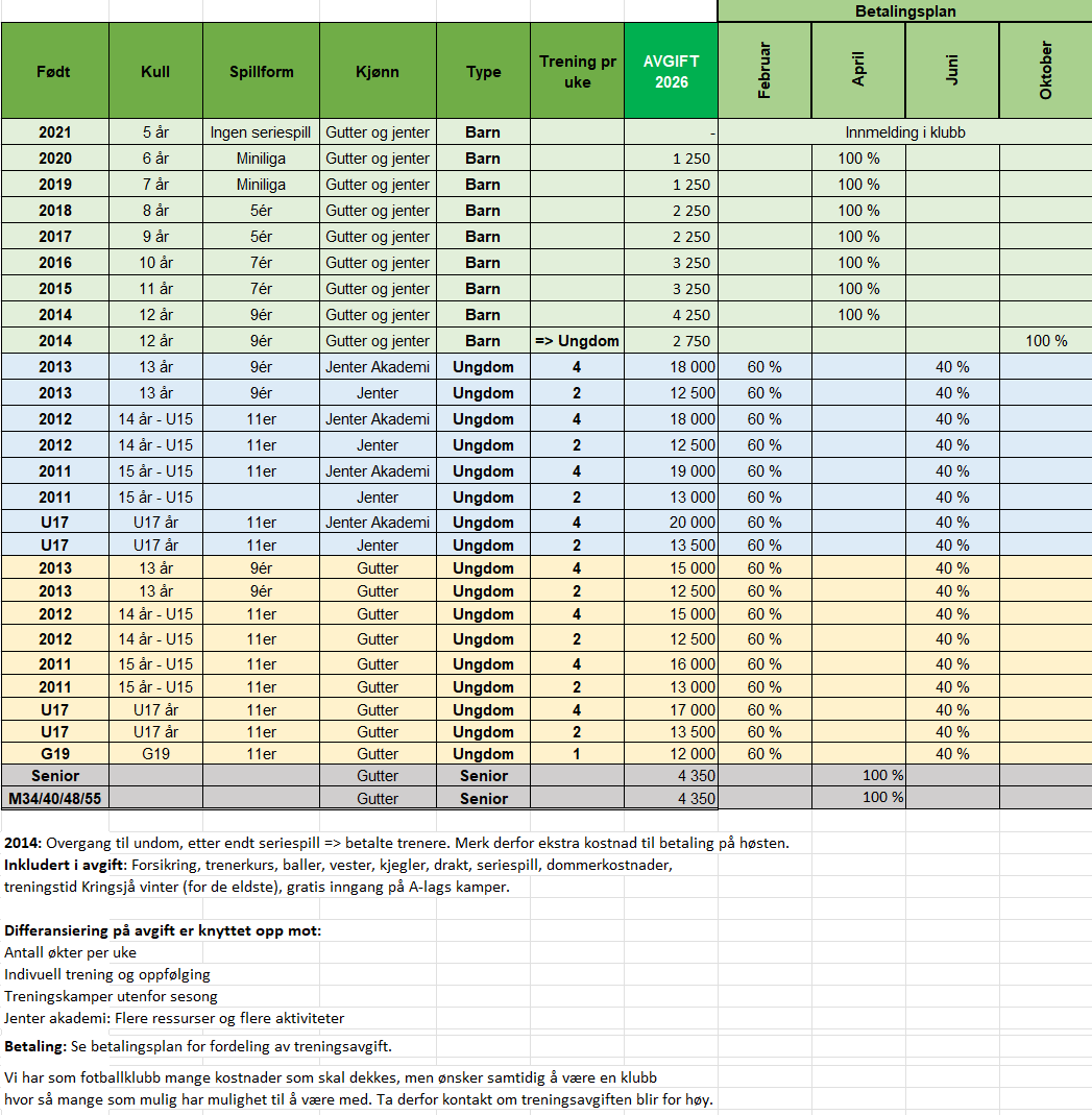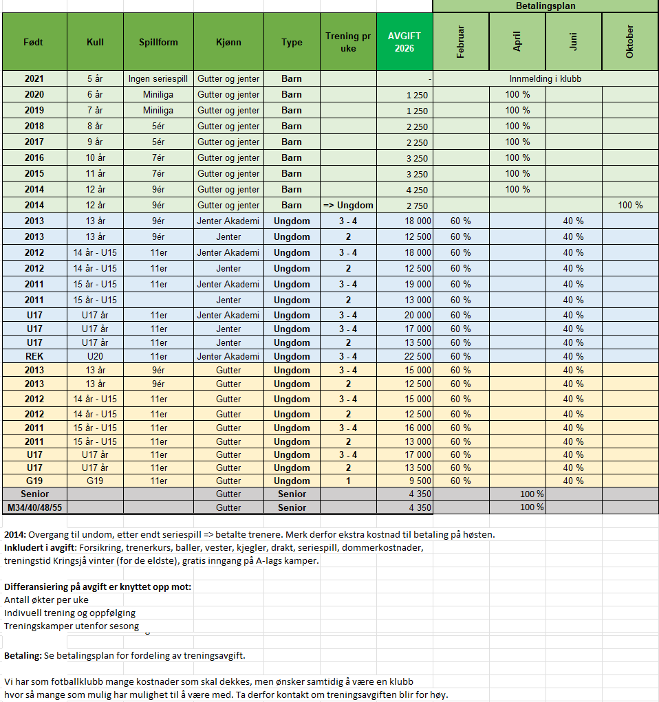 I tabellen under ser man hvor mye hvert årskull skal betale i treningsavgift, samt hvor stor andel av treningsavgiften som faktureres når.